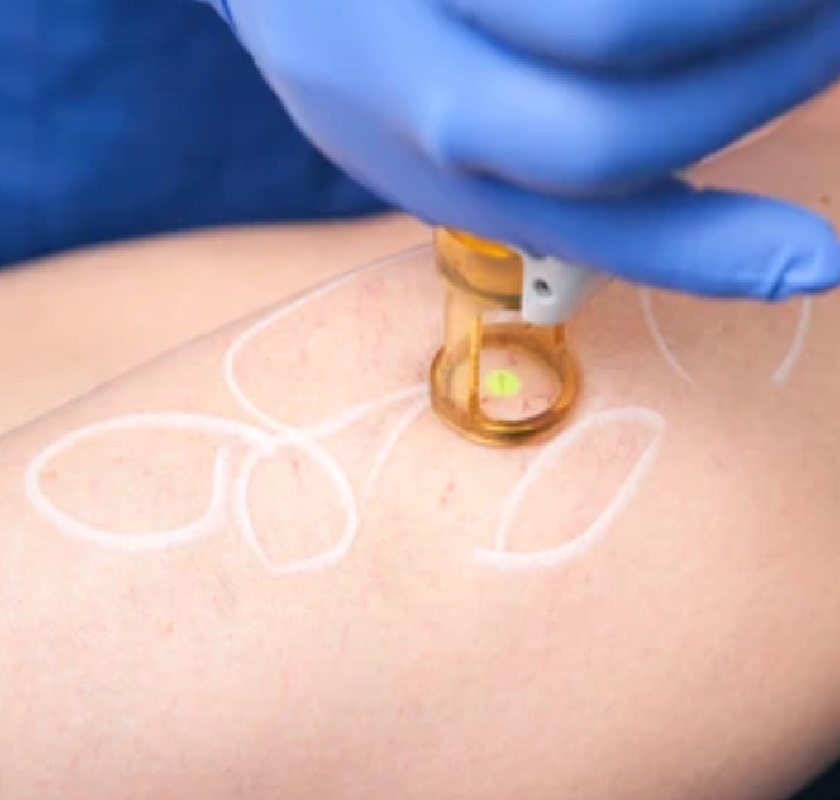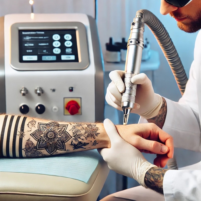 Q-switched- tai pikosekuntilaser hajottaa tatuointivärin pieniksi hiukkasiksi, jotka elimistö poistaa luonnollisesti – turvallinen ja tehokas tapa päästä eroon ei-toivotuista tatuoinneista.